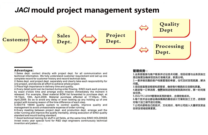 jaci mould has made its own perfect production and management system. There are strict quality control managements in each process. We try our best to avoid mistakes, and put an end to extend mistake to the next process. Its ranges: from design analysis and inspection of plastic products to the research on design feasibility of mould, from material purchasing to quality inspection of material, from processing technic selection and arrangement to quality inspection, from mould assembling and installation to mould test, etc.. For each process, there are homologous table and quality inspection standard. Each link should be ensured without defect, and then we can keep the delivered moulds qualified.